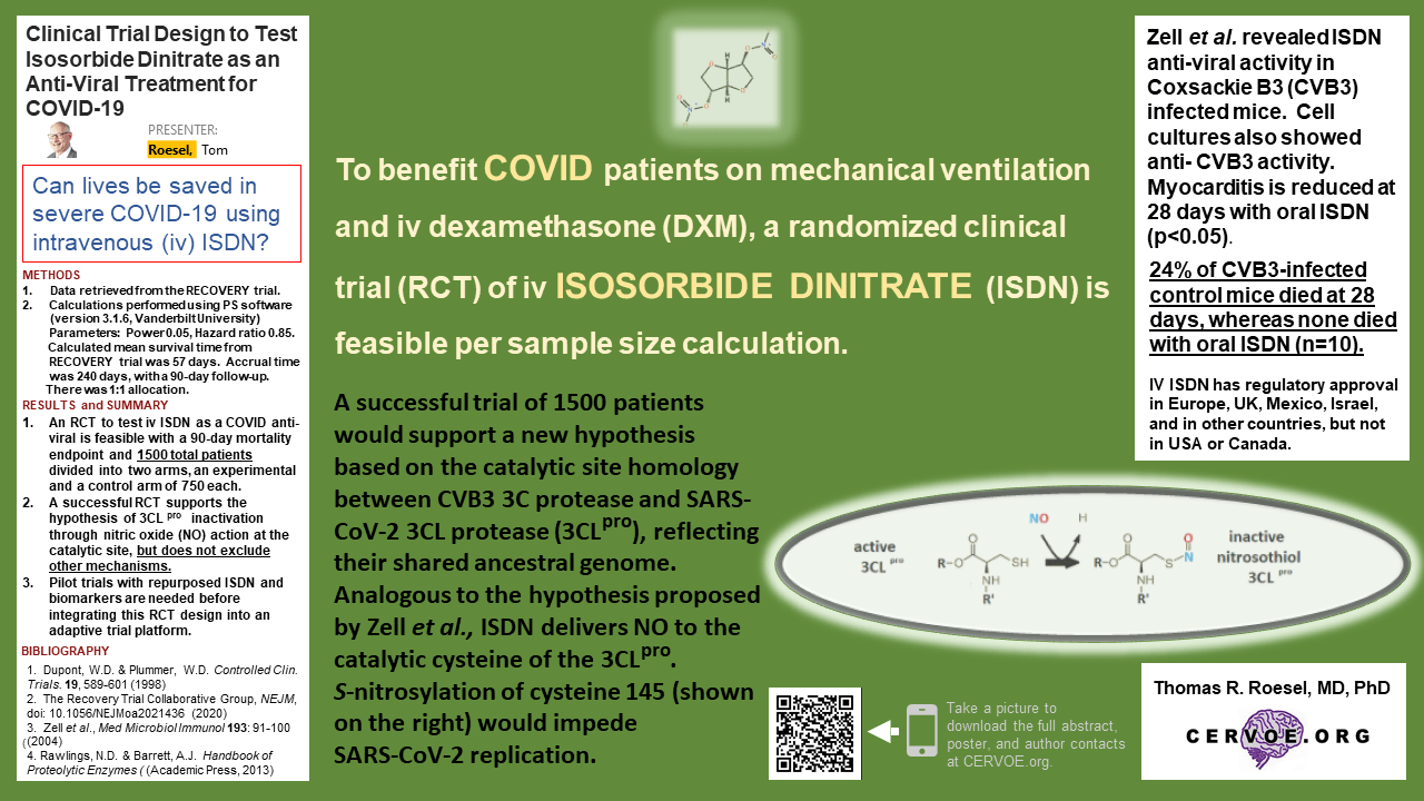 This is the title of the poster abstract that was presented at the 2021 American Heart Association Scientific Sessions virtual meeting last month with the support of CERVOE.org. A successful randomized clinical trial would demonstrate that isosorbide dinitrate can help this cohort of COVID patients that have a very high mortality. It would also add to the evidence that isosorbide dinitrate has anti-viral properties by inactivation of the SARS-CoV-2 main protease (Mpro). S-nitrosylation of cysteine 145 in the active catalytic site is the posited mechanism of action.